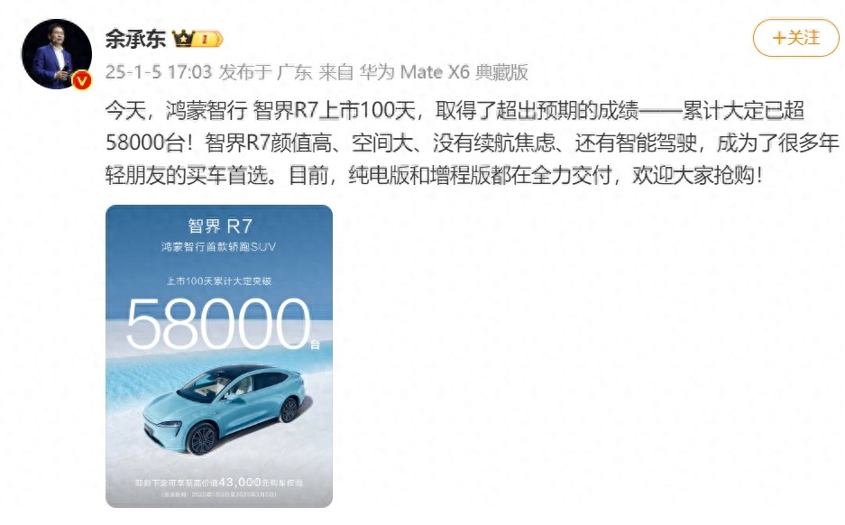 1月6日消息,日前,鴻蒙智行發文稱,智界R7上市100天累計大定突破5.8萬臺。