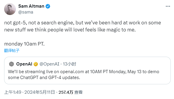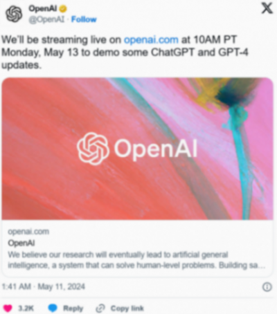 OpenAI的春季更新活動將于美西時間5月13日上午10點(北京時間14日凌晨1點)正式開始,將以網(wǎng)站直播的方式進(jìn)行。