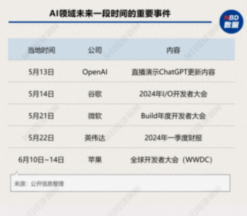 從OpenAI直播演示ChatGPT更新內(nèi)容和谷歌的I/O開發(fā)者大會2024,到微軟的Build年度開發(fā)者大會,“姍姍來遲”的英偉達(dá)一季報,再到蘋果的年度開發(fā)者大會(WWDC),可以說,從生成式AI到AI硬件,關(guān)于AI的方方面面將貫穿未來的一個月。