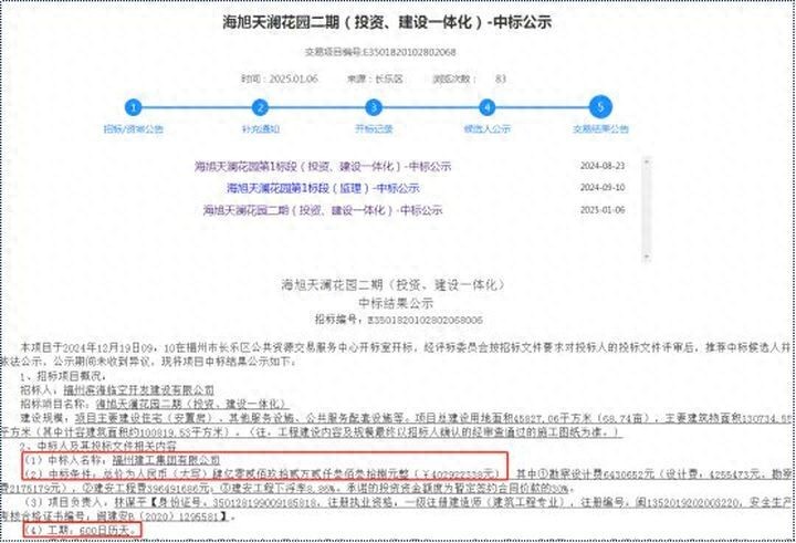 1月6日,根據福州市公共資源交易網發布“海旭天瀾花園二期(投資、建設一體化)-中標公示”,海旭天瀾花園二期中標人為福州建工集團有限公司,中標金額約4億元,工期600日歷天,主體工程設計分包單位福建西海岸建筑設計院有限公司。
