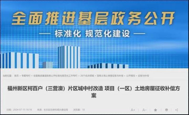 今年7月15日,長樂區住房和城鄉建設局發布“福州新區柯百戶(三營澳)片區城中村改造項目(一區)土地房屋征收補償方案”。