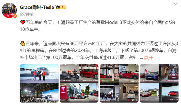 1月7日,特斯拉公司副總裁陶琳發文回顧稱:五年前的今天,上海超級工廠生產的首批Model 3正式交付給來自全國各地的10位車主。