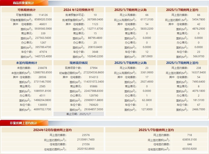 北京市住建委官網數據顯示,1月7日北京新房網簽304套,網簽面積21792.72㎡,其中住宅網簽96套,網簽面積12366.93㎡。二手房網簽718套,網簽面積63859.31㎡,其中住宅網簽646套,網簽面積60350.92㎡。