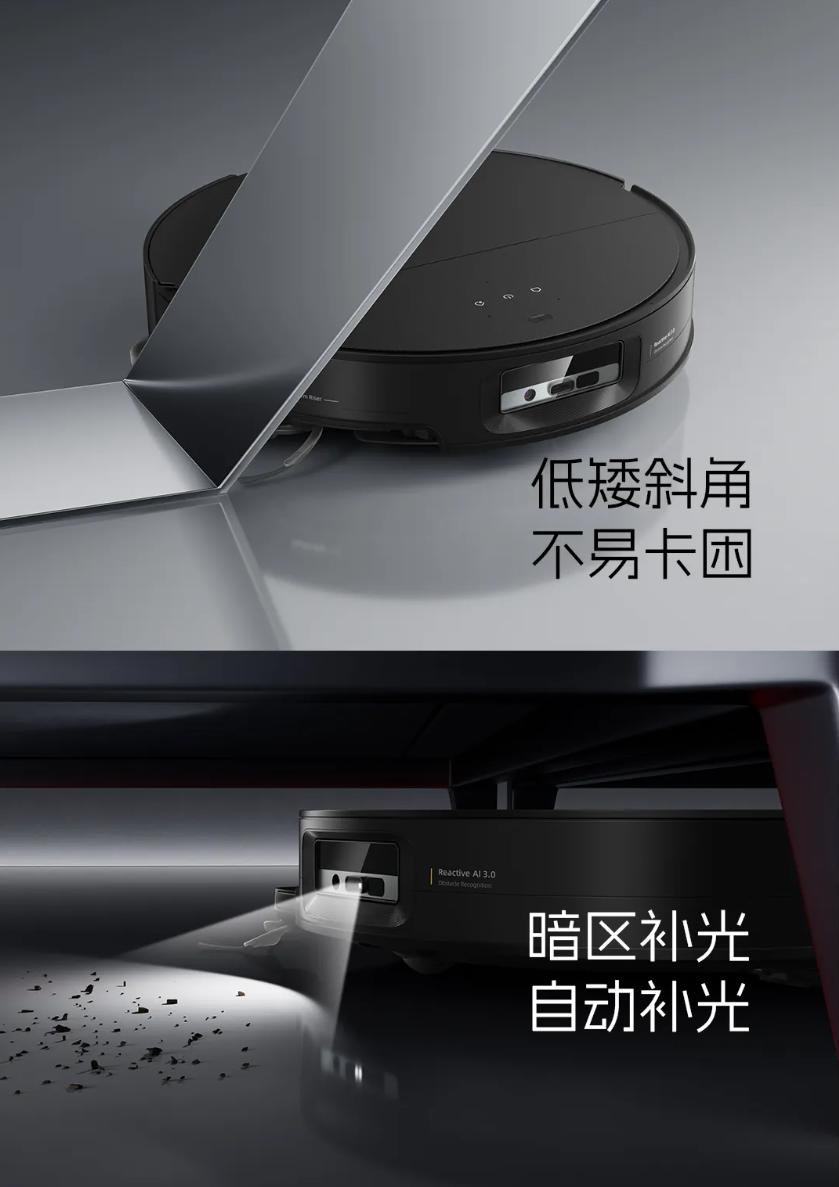 該款掃拖機器人采用弧形底部設計,可進入低矮家具底部、低矮斜角進行清掃,同時支持暗區補光 / 自動補光特性。