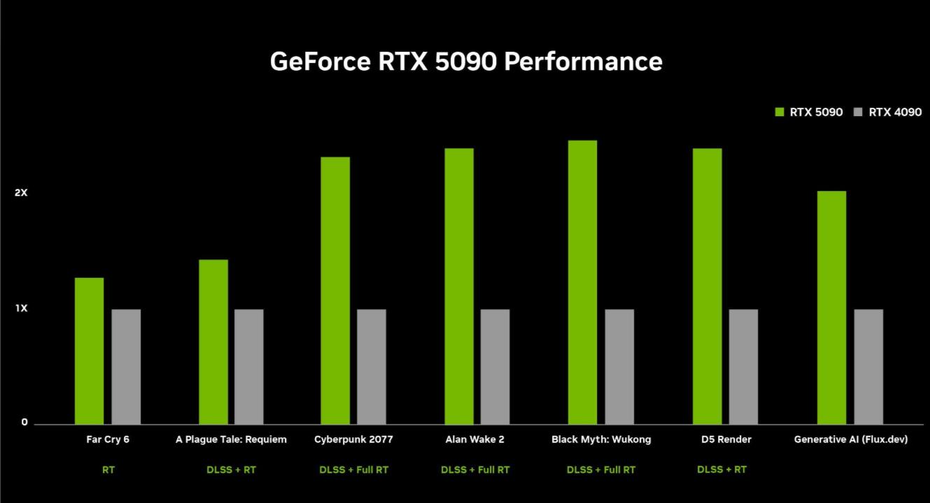 不得不說,這次外觀真的好看,RTX5090只有雙槽。從英偉達公布的官方對比圖來看,5090在開啟DLSS 4加全光線追蹤的模式下,幀數(shù)比4090普遍提升了至少三成,有些項目甚至接近翻倍。比如賽博朋克2077、心靈殺手2、黑神話悟空這種,綠色長條都高出一大截。