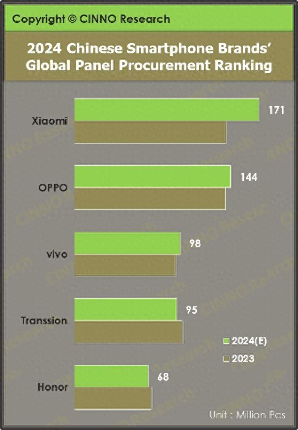 vivo 的表現同樣搶眼,預計其 2024 年的智能手機面板采購量將達到 9800 萬片,同比增長 4.2%。