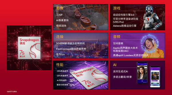 配置方面,真我14 Pro+搭載高通驍龍7s Gen 3移動平臺。驍龍7s Gen3是高通推出的第三代中端移動平臺,采用4nm制程工藝,CPU性能提升20%,GPU性能提升40%,AI性能提升30%,整體功耗降低12%,支持包括Baichuan-7B和10億參數的Llama 2等大語言模型。
