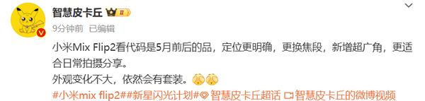 據(jù)博主@智慧皮卡丘 爆料,小米MIX Flip 2看代碼是5月前后的新品,定位更明確,更換焦段,新增超廣角,更適合日常拍攝分享。該博主還提到,新機(jī)的外觀變化不大,依然會(huì)提供套裝選項(xiàng)。