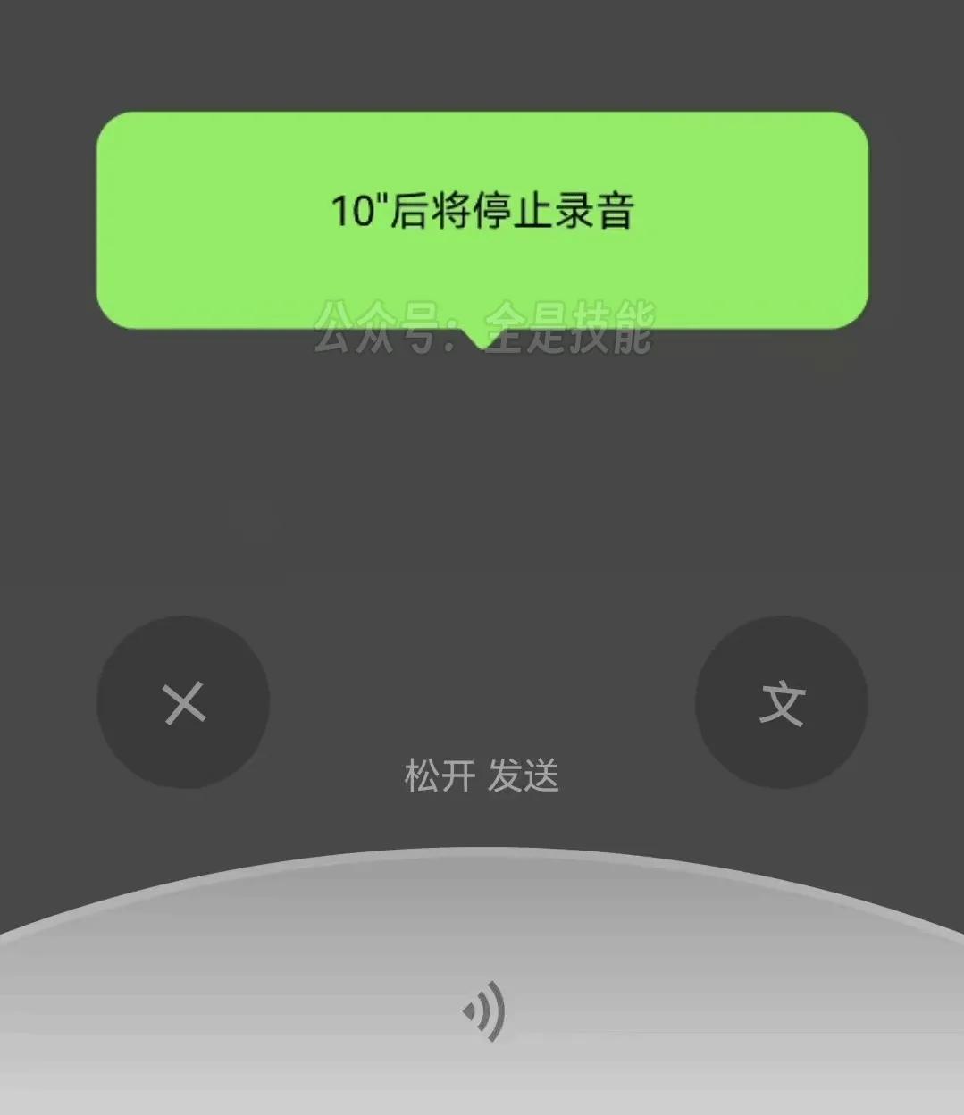 在聊天中錄制語音消息時,如果錄制的語音時長較長,即將到達60秒極限時,系統會在最后倒數10秒,彈出“×秒后將停止錄音”的動態倒計時提醒,同時手機伴有短暫的振動效果。時長一到,語音消息即自動發送。