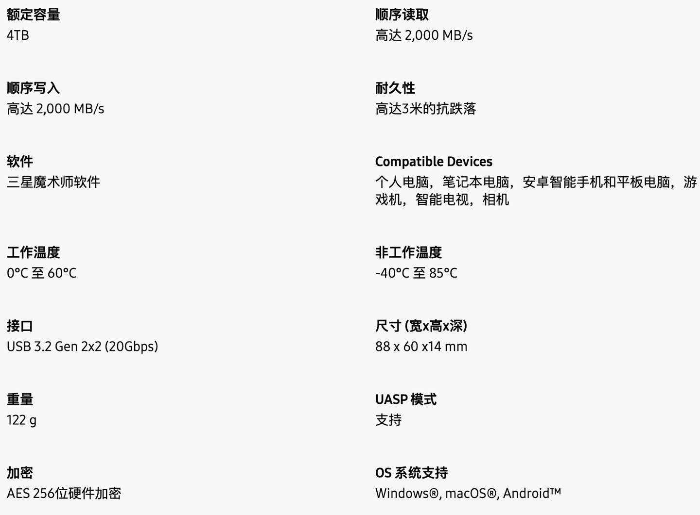 據(jù)介紹,系列硬盤采用 USB 3.2 Gen 2x2 接口,順序讀取 / 寫入速度 2000 MB/s,重量 122 克,擁有 3 米的抗跌落能力及“動態(tài)散熱防護裝置”,國行提供 5 年保修。