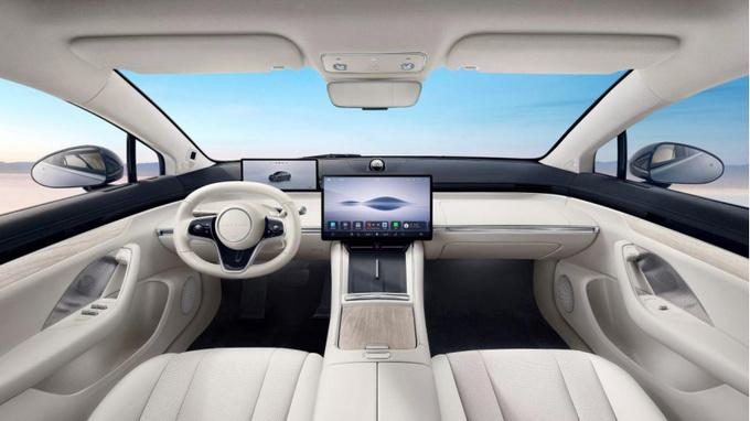 而走進智己L6的車內,屏幕幾乎完全充斥了你的視野。26.3英寸主屏和15.5英寸副駕屏橫跨整個中控。同時下方還配有一塊10.5英寸操作屏,構筑了T型布局的矩陣。雖然目前所展示的車型配備了半幅方向盤,但同時也有傳統方向盤可選。