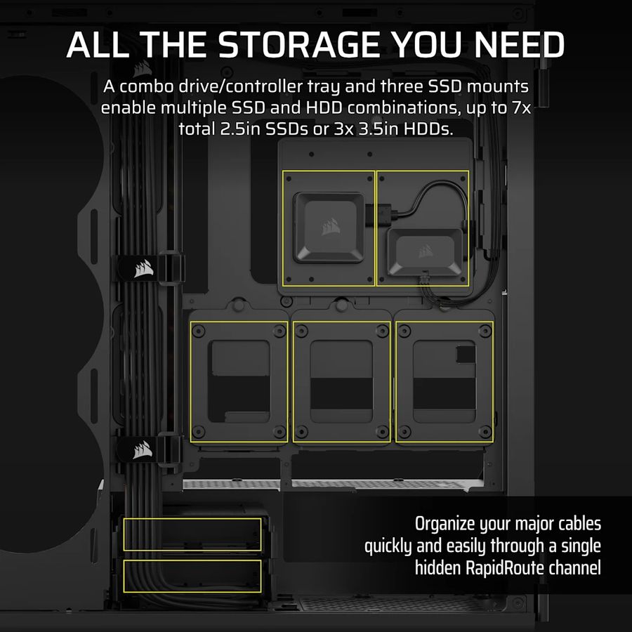 5000T 系列中塔機箱可拆卸前后擋板,最多支持 10 個 120mm 或 4 個 140mm 風扇,同時兼容多個散熱器,前后或側面均可安裝 360mm 散熱器。