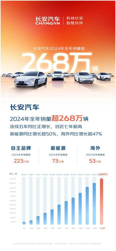 2024年長(zhǎng)安汽車(chē)銷(xiāo)量超過(guò)268萬(wàn)輛,其中,中國(guó)品牌的銷(xiāo)量實(shí)現(xiàn)223.萬(wàn)輛,同比增長(zhǎng)6.3%;新能源銷(xiāo)量突破73萬(wàn)輛,同比增長(zhǎng)52.4%;即使在海外市場(chǎng)上長(zhǎng)安也賣(mài)出了53萬(wàn)輛,同比增長(zhǎng)超過(guò)47%;這個(gè)成績(jī)創(chuàng)了長(zhǎng)安汽車(chē)7年以來(lái)的新高;