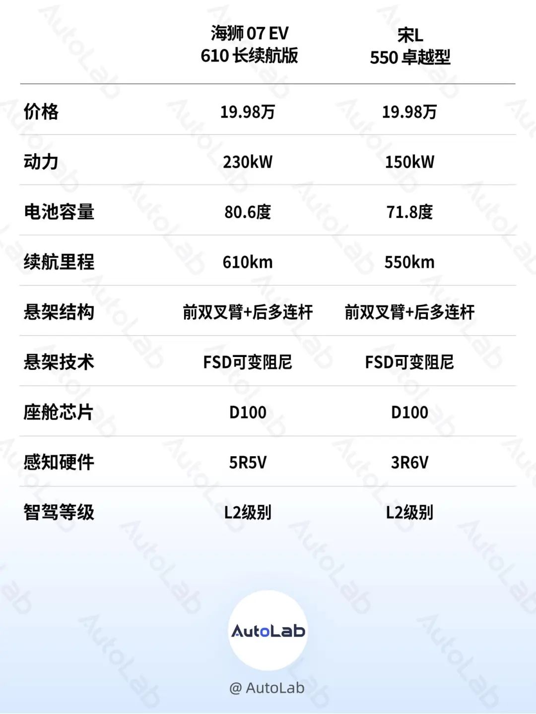 在這里我們選擇了價格相同的海獅 07 EV 610 長續航版和宋 L 550km 卓越型來進行對比,看看誰的性價比會更高。