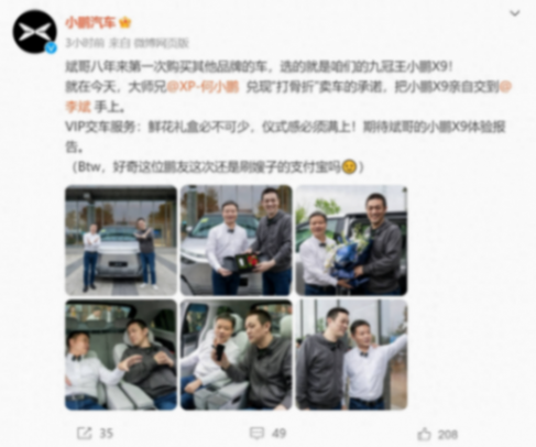 “斌哥八年來第一次購買其他品牌的車,選的就是咱們的九冠王小鵬X9!”小鵬汽車官微寫道。