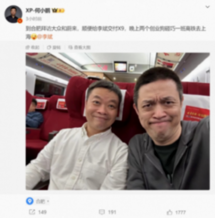 11日晚,何小鵬也在微博發文稱,到合肥拜訪大眾和蔚來,順便給李斌交付X9,晚上兩個創業狗碰巧一班高鐵去上海。