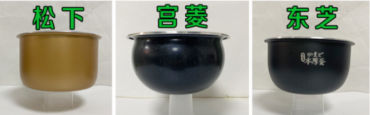 東芝采用的是半釜內膽,產品的加熱均勻度和導熱性能都非常的不錯,但是內膽只有1.5mm,導致米飯口感稍微差一點,希望品牌方可以對內膽的厚度做出改變。松下的內膽形狀為柱形,導熱性能和加熱均勻度比較一般,因為內膽非常薄,導致吃起來米飯的口感比較差,希望品牌方可以改變內膽的形狀以及厚度。