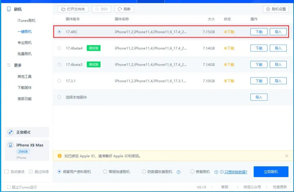 ※3、想降級到其它“蘋果未關閉驗證”版本,不建議勾選“保留用戶資料刷機”,可能會出現刷機失敗或刷機成功后設備異常;建議先使用愛思助手分類備份資料后進行全新刷機,成功后再分類恢復資料;