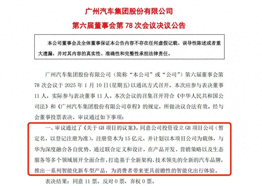 1月10日,廣汽集團(tuán)審議通過(guò)了《關(guān)于GH項(xiàng)目的議案》。同意公司投資設(shè)立GH項(xiàng)目(暫定名),注冊(cè)資本為15億元,并計(jì)劃以其為載體,與華為深度融合各自優(yōu)勢(shì),通過(guò)聯(lián)合定義和設(shè)計(jì),在產(chǎn)品開發(fā)、營(yíng)銷策略以及生態(tài)服務(wù)等多個(gè)領(lǐng)域展開全面合作,打造基于全新架構(gòu)、技術(shù)領(lǐng)先的全新的汽車品牌,推出一系列智能化新車型產(chǎn)品。