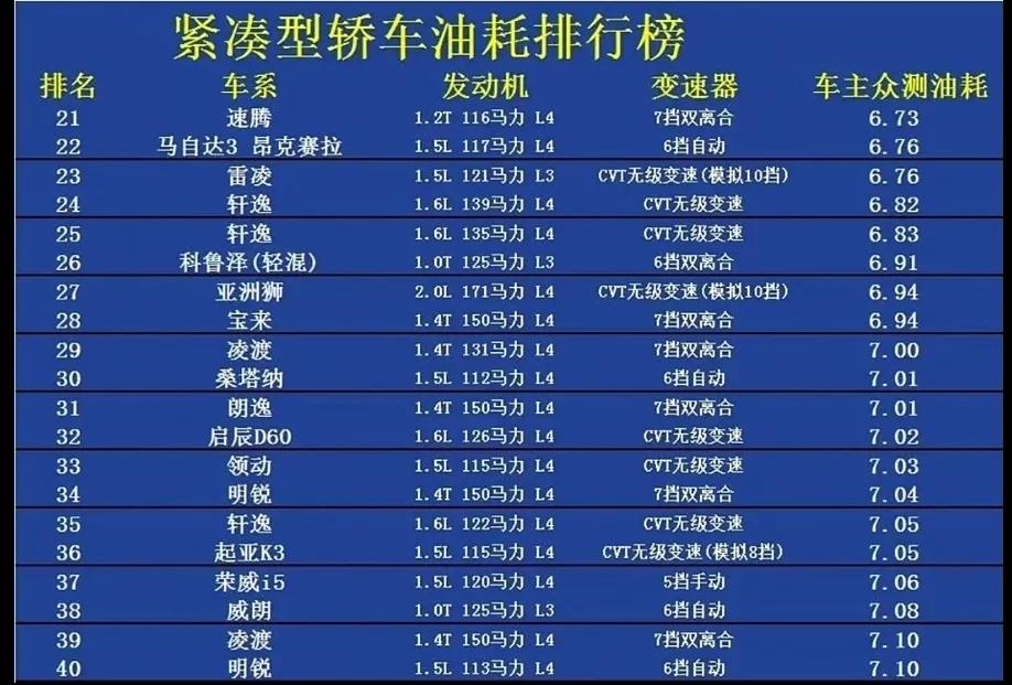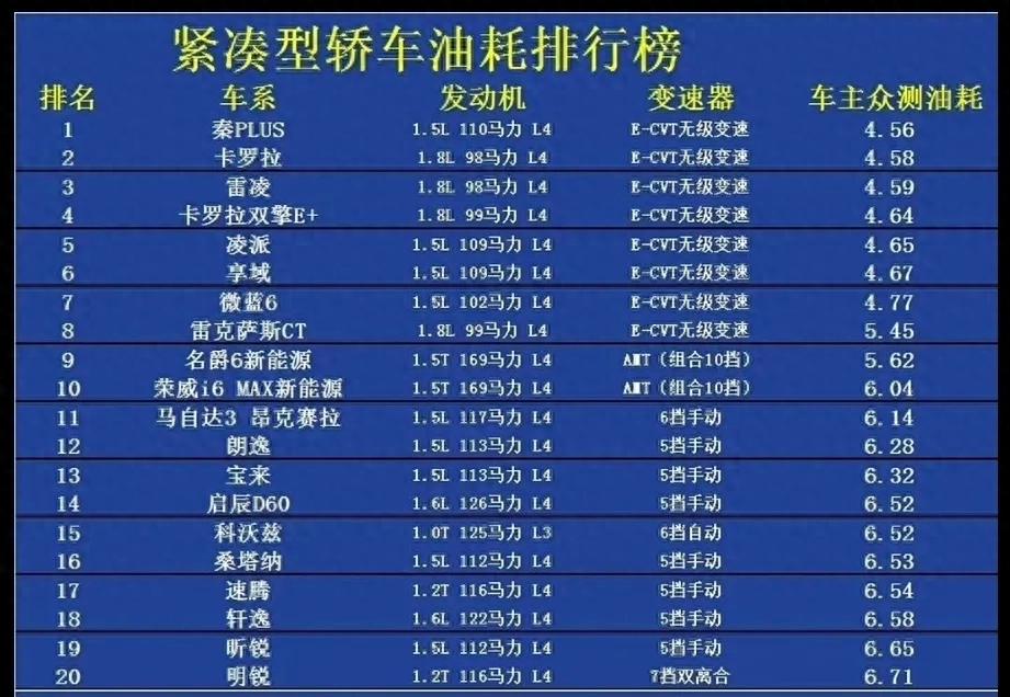 最近一直做油耗排行榜的分析,今天翻到了一份幾年前的緊湊型轎車油耗榜單,很純粹,那時候的混動王者是豐田,比亞迪的DMI混動技術還沒有。在油耗這一領域自主品牌處于一直在追趕合資品牌的行列。接下來我們一同看看這一份排行榜。