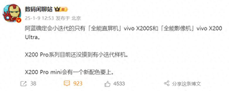 現在到了vivo X200系列,這一次小迭代時Pro版又沒了。信息是來自知名爆料人“數碼閑聊站”,據他講vivo確定小迭代的只有“全能直屏機”vivo X200s以及全能影像機vivo X200 Ultra。vivo X200 Pro系列目前沒有摸到有小迭代樣機,但vivo X200 Pro mini會有一個新配色上。換言之vivo這個首款小屏旗艦也是不會小迭代的。這好像是又回到了vivo X90系列的玩法之上,其實不更新Pro系列在當下是最明智的選擇,僅僅換個處理器其它細節小升級并沒有多大意義,不如把標準版做的更強。