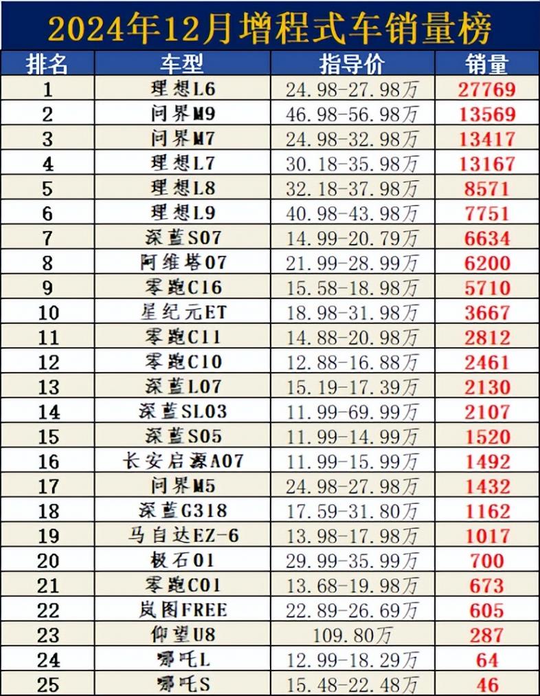 增程式車型的增多,帶來的是越來越激烈的市場競爭。曾經被理想獨享的市場現在入場的品牌也越來越多,問界,深藍,零跑都開始在這一市場發力。據最新公布的12月增程式車銷量榜顯示,有4款車型銷量破萬,理想和問界是最大的贏家,理想L6再次登頂,問界M9排名第2,問界M7退居第3,理想L7,L8,L9三款車型依次排在第4-第6名,深藍S07,阿維塔07,零跑C16都進前10,反觀哪吒L和哪吒S則銷量不佳,排名處在榜單墊底位置。官宣!12月增程式車銷量,理想L6奪冠,阿維塔07第8,仰望U8第23