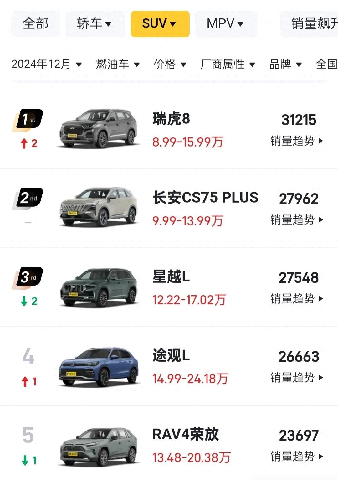 情況在12月份發(fā)生了變化,奇瑞瑞虎8以31215臺(tái)銷量奪冠,長(zhǎng)安cs75plus以27962臺(tái)銷量位居其后,星越L則以27548臺(tái)跌至第三。