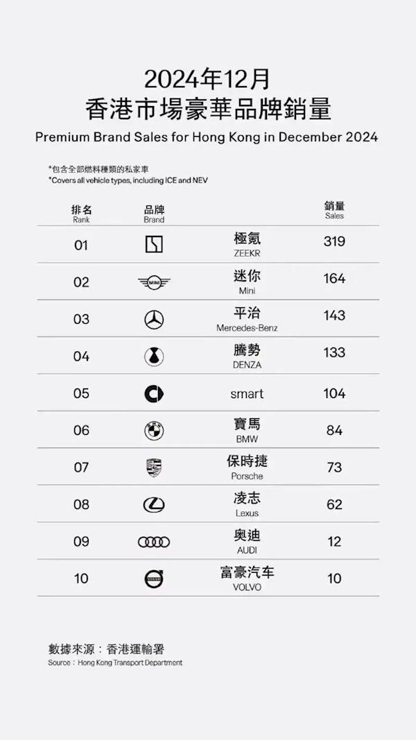 據悉,極氪品牌12月在香港的銷量達到319臺,成為當月香港市場豪華品牌的銷量冠軍,其中極氪009車型榮獲MPV銷量冠軍。