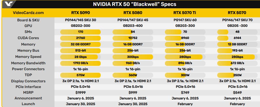 具體而言,GeForce RTX 5090的建議零售價為1999美元,GeForce RTX 5080的建議零售價為999美元,GeForce RTX 5070 Ti的建議零售價為749美元, GeForce RTX 5070的建議零售價為549美元。