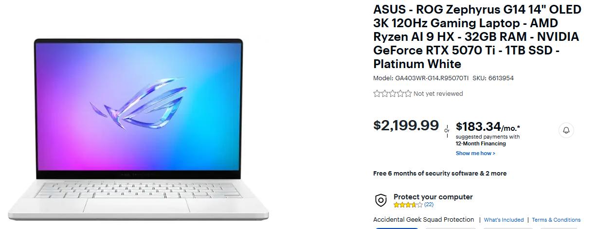 在GeForce RTX 5070 Ti移動版機型方面,華碩ROG Zephyrus G14搭載AMD Ryzen AI 9 HX系列處理器(目前未公布具體型號),搭載32GB內存,2TB固態(tài)硬盤,售價為2199美元。