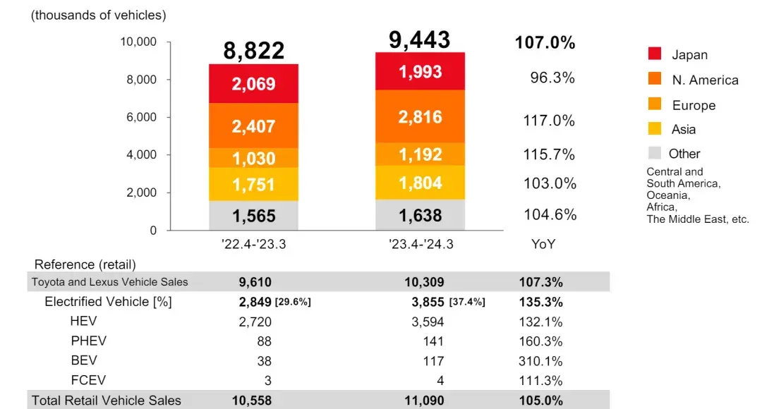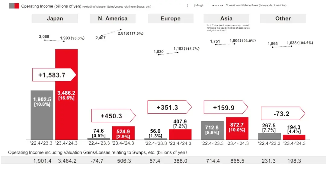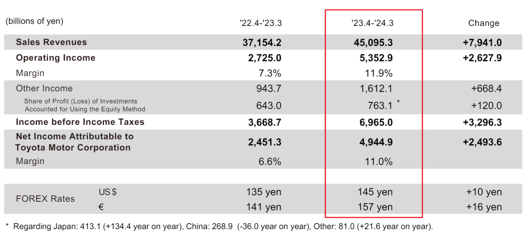 這個數據當然比FY2021-FY2023財年要好點,但是確實是去年不可復制。疫情過后供應鏈修復、市場供應回暖,導致前幾年被供應不足壓抑的需求得以釋放,整體車價也比較高。日元疲軟提振了海外銷售的價值,以及市場對其需求的加速增長,也額外提升了豐田以日元計算的收入。