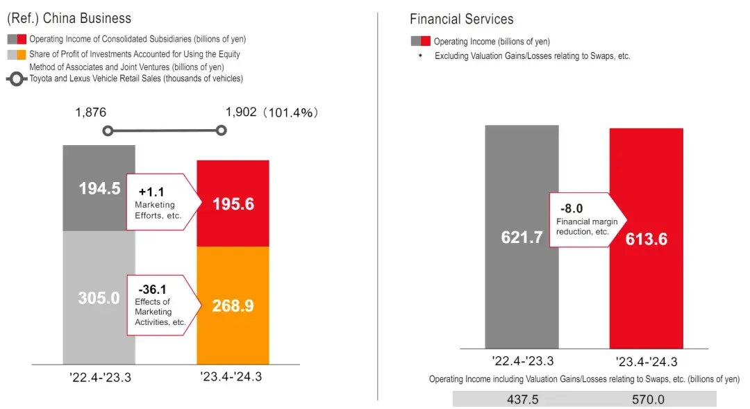 在中國,豐田的銷售情況帶來的努力效果有限。2023年豐田汽車(含豐田和雷克薩斯)實現同比微增1.4%;但豐田品牌2023年銷量中國市場同比下滑1.7%。豐田在中國市場合并子公司收益為1956億日元,同比增長11億日元,在豐田總利潤中的占比不足4%。