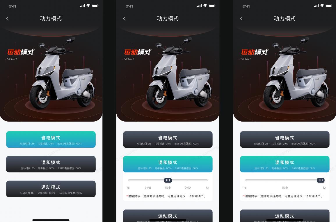 然后是一些進階智能玩法,比如在「騎行管家」板塊,我們可以對動力模式機型調節。綠源S75作為電摩,速度最高可達55+KM/h,動力還是挺強的,但有時在市內騎行時,用不到這么強的動力,就可以設置溫和模式,而且還能單獨對速度進行調節。除了溫和模式以外,還有省電、運動模式可選,可以滿足不同路況的騎行需求,這點做得還是挺好的。