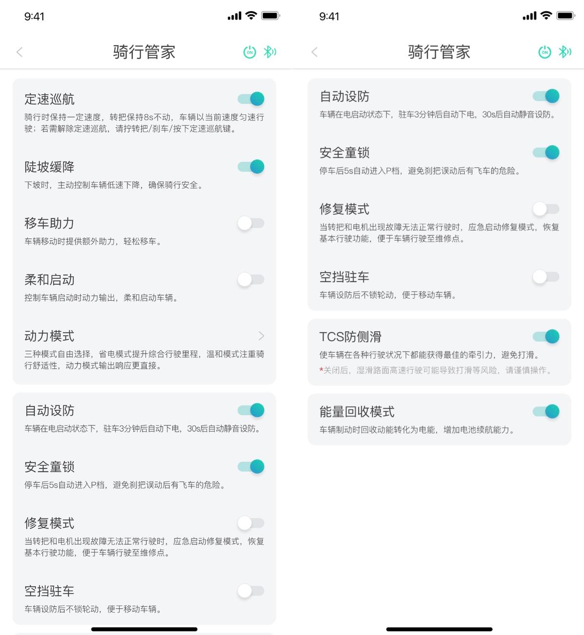 同樣在「騎行管家」板塊中,還能開啟一些輔助騎行的功能。就比如我最用得最多的定速巡航功能,在APP開啟該功能后,平時騎車時保持速度一段時間后,就會自動進入定速巡航模式,這時候就不用一直握著電門轉把了,想要解除定速巡航的話也很簡單,擰一下電門轉把或點一下剎車就可以了。這功能屬于是旦用難回的一種,如果你的電動車也支持這個功能,很建議去體驗下。