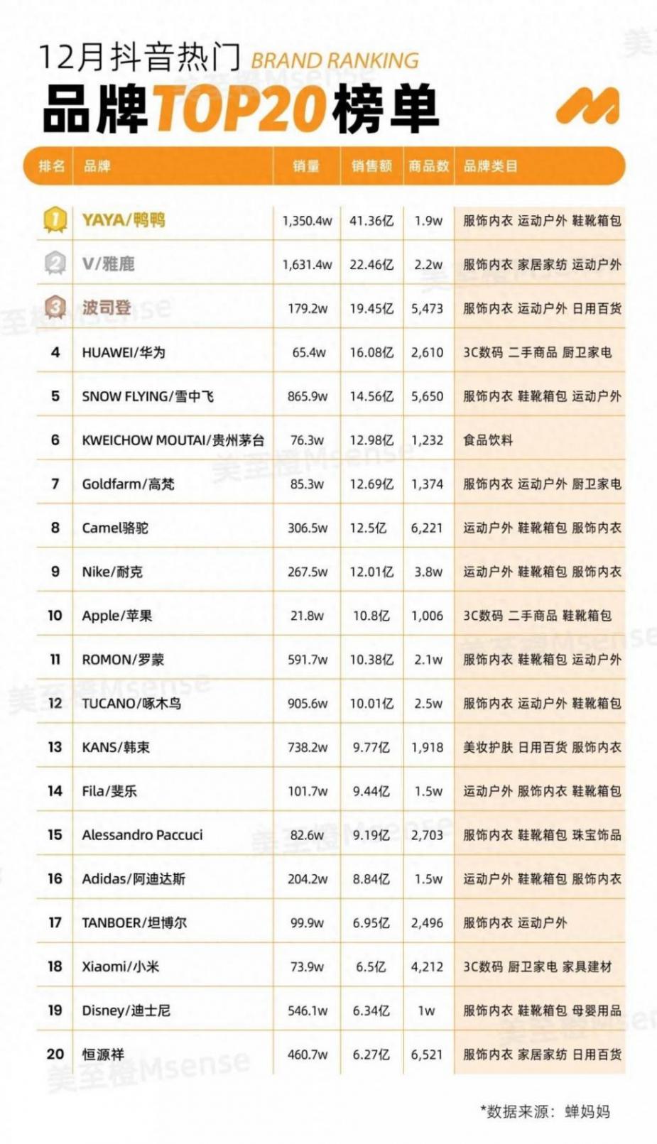 12月氣溫驟降,羽絨服的銷售額卻在火熱攀升。從12月抖音熱門品牌榜看,羽絨服品牌強勢霸占前三名,消費者心智逐漸向高性價比的國貨品牌靠攏。