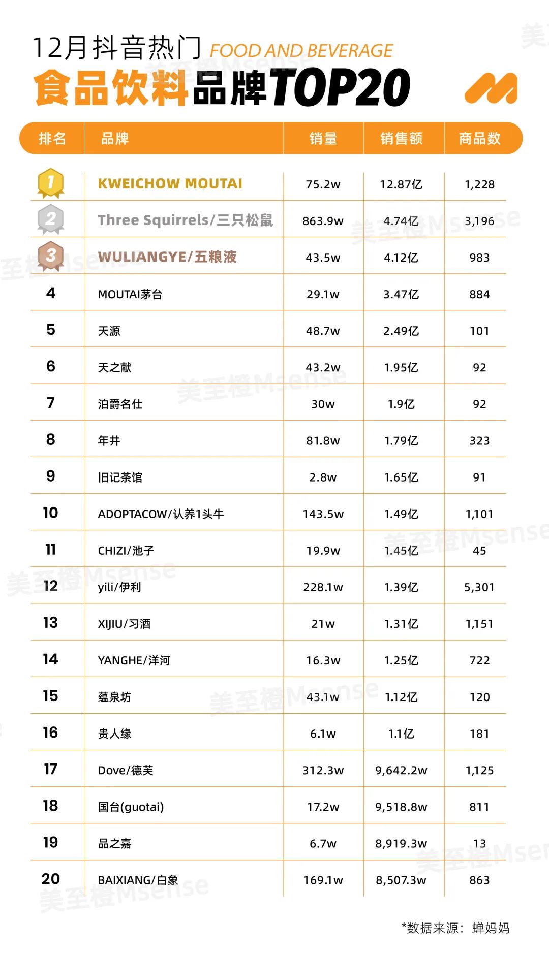 在12月抖音食品飲料熱門品牌榜中,貴州茅臺以12.87億的銷售額位列第一,緊隨其后的是銷售額4.74億的三只松鼠,和銷售額4.12億的五糧液。
