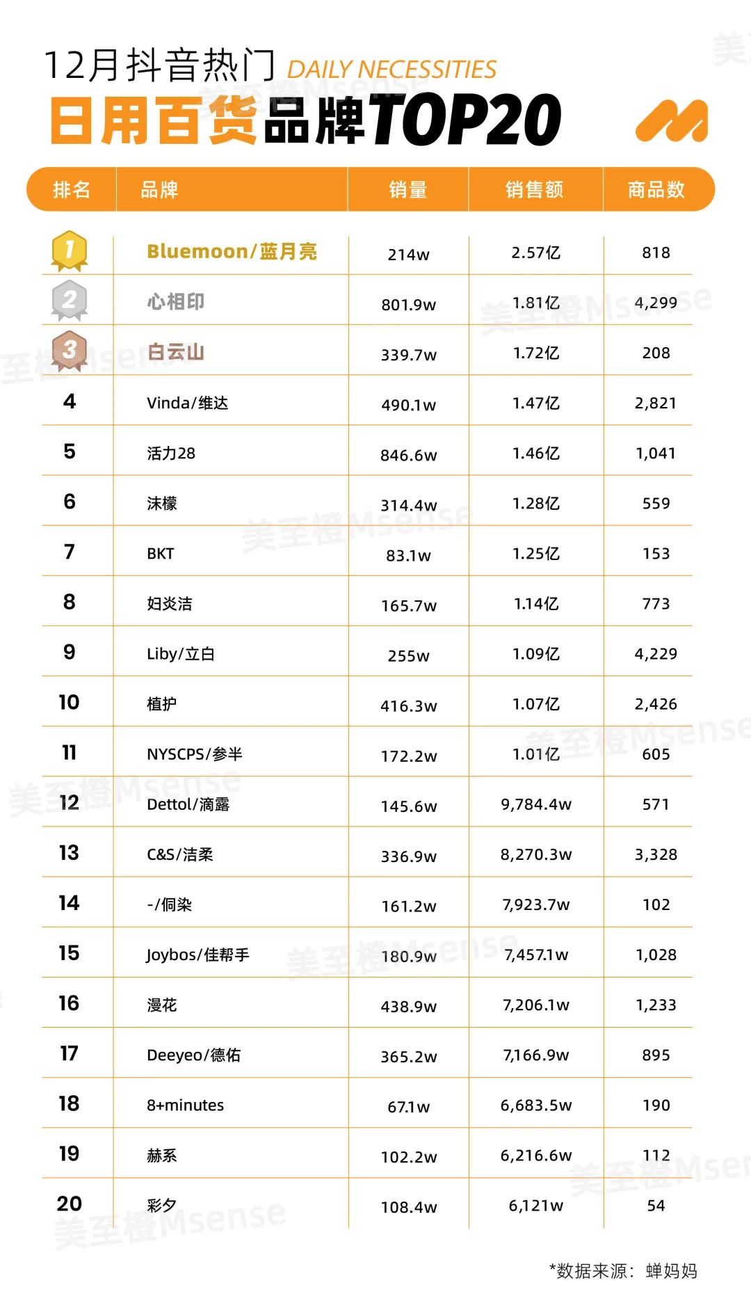 12月日用百貨熱門品牌榜中,前三名銷售額差距不大。Bluemoon藍月亮、心相印以及白云山分別以2.57億、1.81億、1.72億的銷售額位列TOP3。