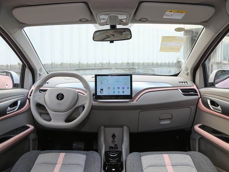 EV3 Plus 的內部看起來相對簡單,儀表板上安裝了一個中央信息娛樂屏幕。這大概兼作儀表顯示屏,因為似乎沒有單獨的屏幕。圖片展示了一輛粉紅色的汽車,這也將粉紅色的主題延伸到了內飾。