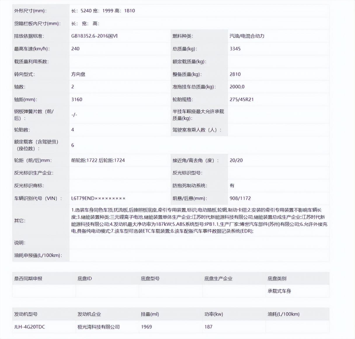 車身側面,兩側均配有類似于領克08的縱向延展的LOGO呼吸燈,具有迎賓燈效、充電燈效。寬大的輪眉,超高的離地間隙,搭配超大尺寸輪轂,富有很好的通過能力。尾部,兩側由點陣式燈組+發光LOGO拼接的貫穿式尾燈組設計。新車的長寬高分別為5240/1999/1810mm,軸距為3160mm。