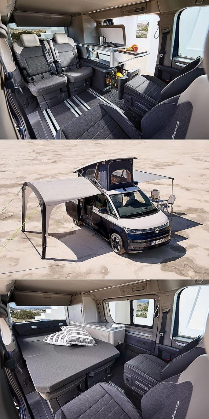 除了車室空間變得更加寬敞,讓這款露營車在生活起居空間更為舒適之外,在運用靈活性上也同樣有所提升,T7 California 采用雙邊側滑門設計,意味著能夠兩側進出車室,一改原先單邊側滑門設計,也讓兩側都能搭配車邊帳來使用。