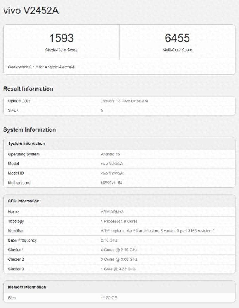 1 月 14 日消息,繼 iQOO Z10 Turbo Pro 手機(搭載高通驍龍 8s 至尊版芯片)跑分曝光之后,iQOO Z10 Turbo 手機也現身 GeekBench 跑分庫,6.1.0 版本單核成績為 1593 分,多核成績為 6455 分。