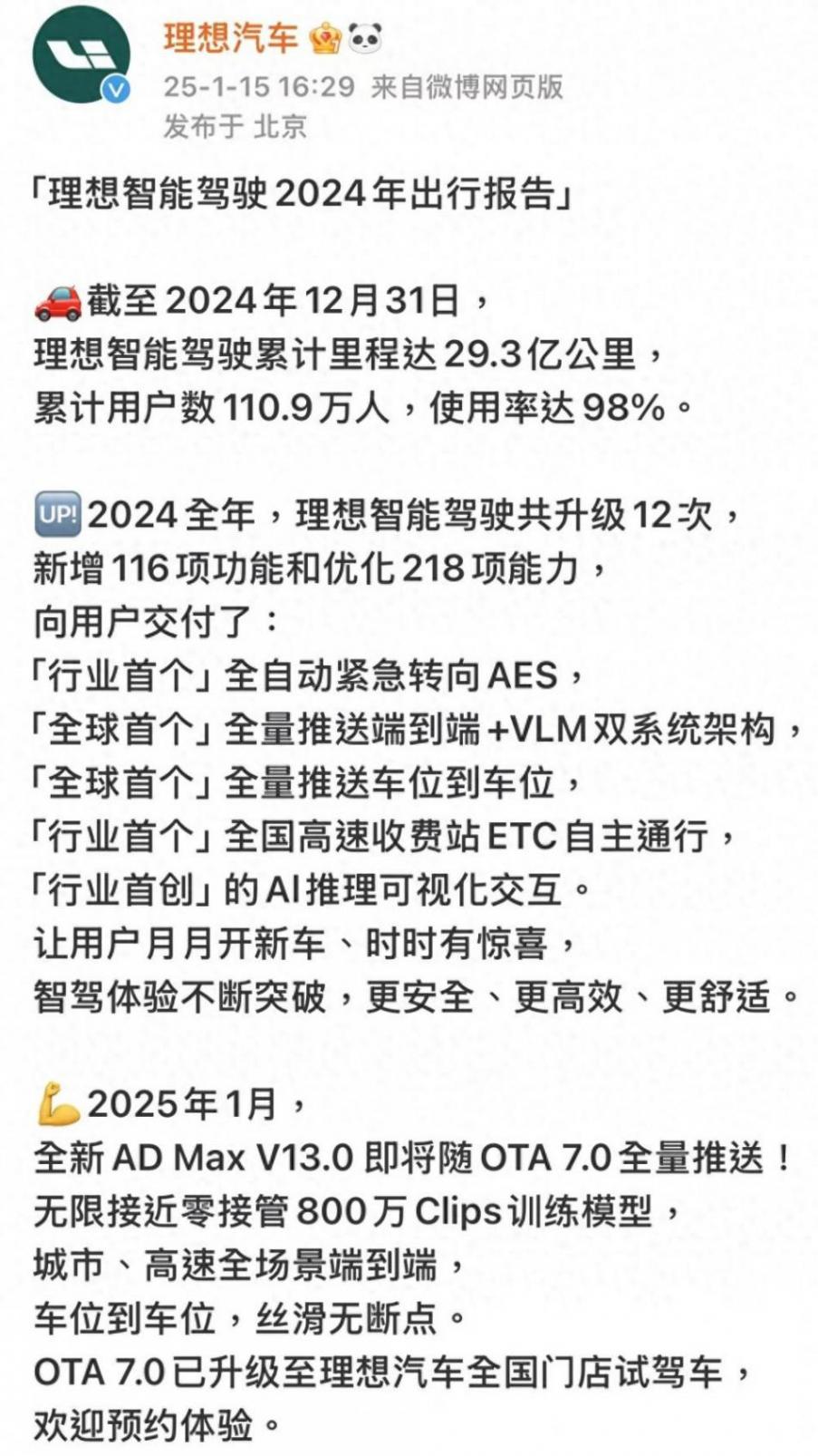 1月15日宣布,截至2024年12月31日,理想智能駕駛累計里程達29.3億公里,累計用戶數110.9萬人,使用率達98%。2024全年,理想智能駕駛共升級12次,新增116項功能和優化218項能力。