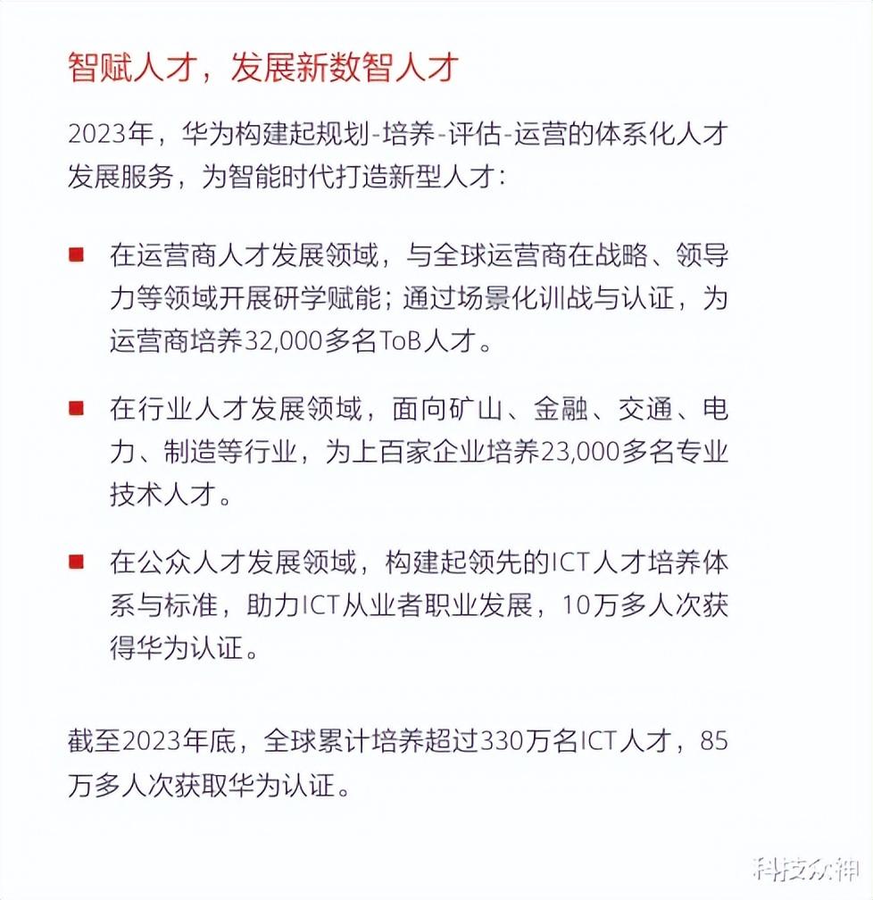 截至2023年底,在全球累計培養超過330萬名ICT人才,85萬多人次獲取華為認證。