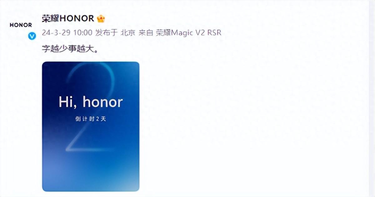 不過(guò)就在今天,榮耀也突然官宣3月31日也就是兩天后又重大消息公布,配圖僅有簡(jiǎn)單的“Hi, honor”字樣搭配倒計(jì)時(shí)2天,配文更是只有“字越少事越大”。連榮耀的其它賬號(hào)也都齊刷刷的表示敬請(qǐng)期待,周日見等