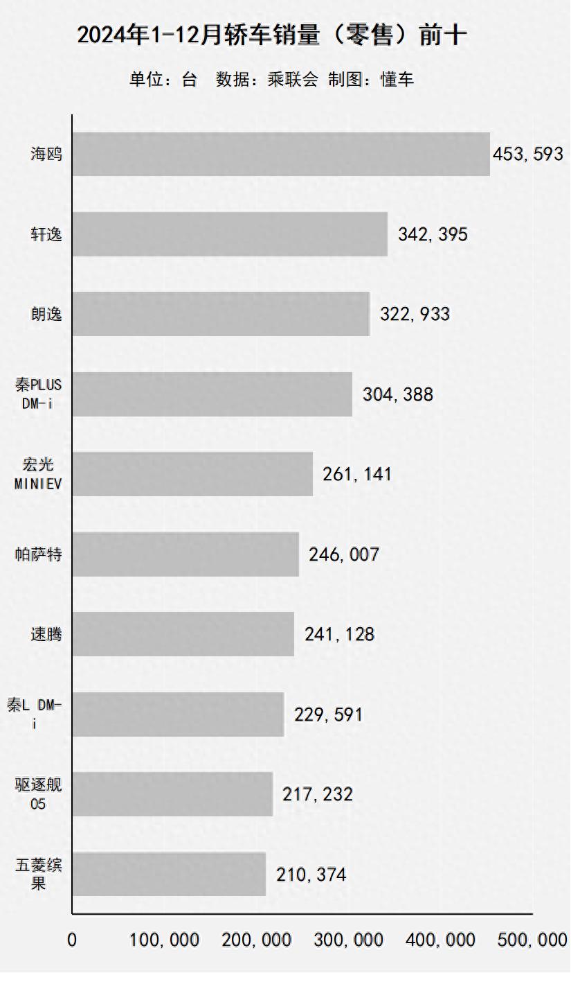 從全年看,轎車銷量達到了1049.3萬輛,同比增長1.8%。全年第一毫不意外地是比亞迪海鷗。這臺車雖然沒有特斯拉Model Y那樣11個月連冠,但也是轎車月銷量9連冠。