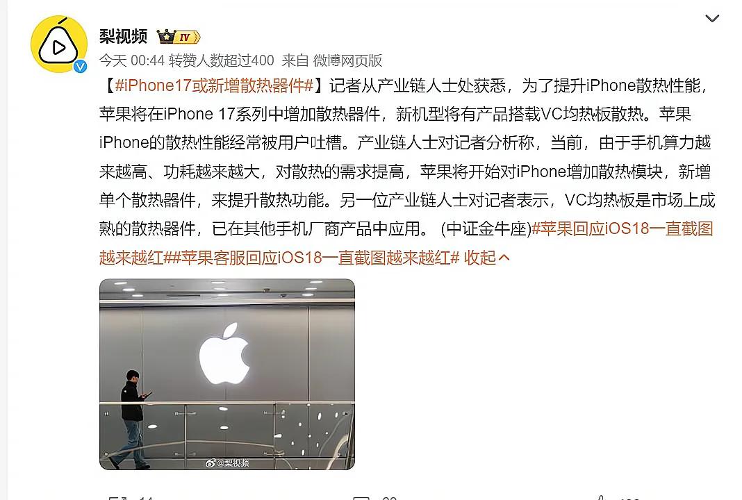 根據產業鏈的消息,iPhone 17系列將繼續加強散熱,將配備VC均熱板散熱,雖然VC均熱板在安卓那邊已經是不值一提的內容,但對于蘋果用戶來說,這的確是王炸般的升級。