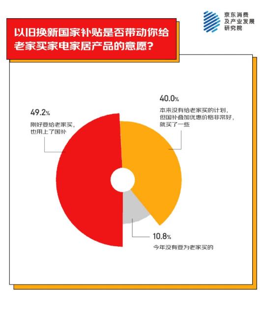 -以舊換新國家補(bǔ)貼政策激發(fā)給老家買家電家居的消費(fèi)熱情,49.2%的人“剛好要給老家買,也用上了國家補(bǔ)貼”,還有40%的人表示本來沒有給老家買家電家居的計劃,“但是國家補(bǔ)貼疊加優(yōu)惠價格非常好,就買了一些”。