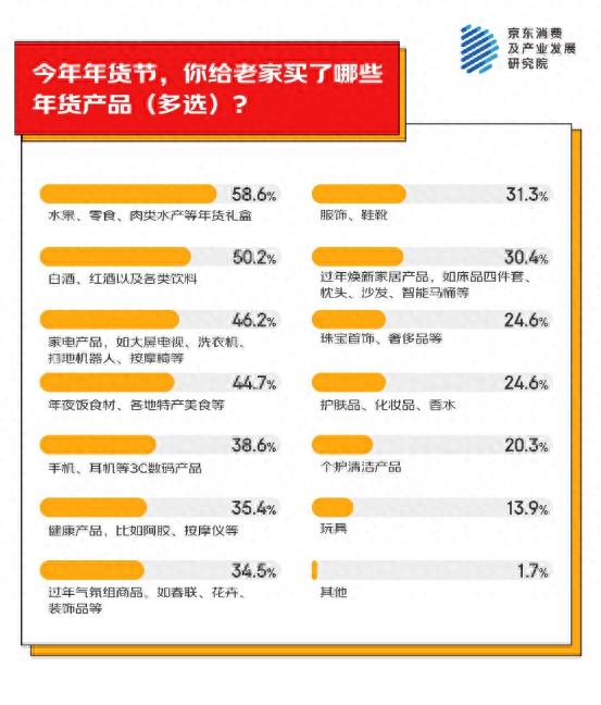 -七成人給老家買年貨的預(yù)算在3000元以上,46.2%的人會給老家買大屏電視、洗衣機(jī)等家電產(chǎn)品,30.4%的人會給老家買智能馬桶、床品等家居產(chǎn)品。