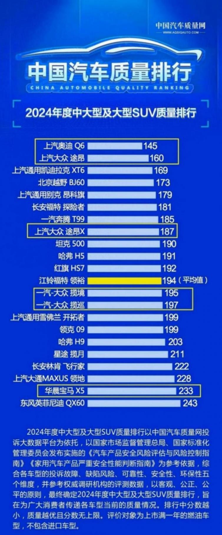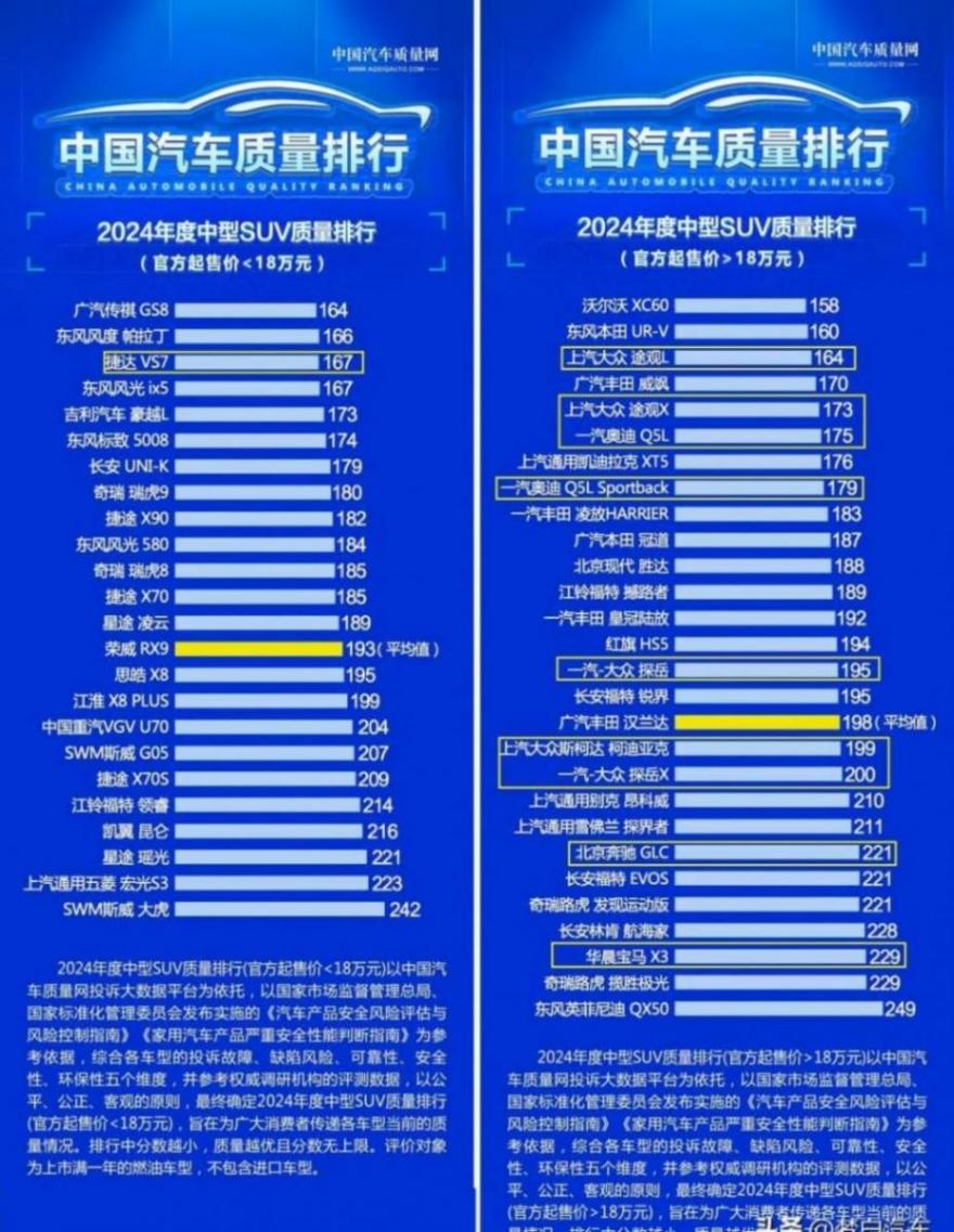 中型SUV,共有10款車(chē)型入榜,其中6款達(dá)標(biāo)。捷達(dá)VS7、上汽大眾途觀(guān)L等憑借過(guò)硬的質(zhì)量成功上榜。途觀(guān)L能在質(zhì)量表現(xiàn)上處于行業(yè)上游水準(zhǔn),靠的可不是運(yùn)氣。它在車(chē)身工藝上有著嚴(yán)苛的標(biāo)準(zhǔn),車(chē)身結(jié)構(gòu)的強(qiáng)度和安全性都經(jīng)過(guò)了精心設(shè)計(jì)和嚴(yán)格測(cè)試。可斯柯達(dá)柯迪亞克、北京奔馳GLC等4款車(chē)型就沒(méi)這么幸運(yùn)。柯迪亞克的質(zhì)量分?jǐn)?shù)僅比平均值多一分,這就有點(diǎn)懸,反映出在競(jìng)爭(zhēng)激烈的中型SUV市場(chǎng),各車(chē)型的質(zhì)量把控都得小心翼翼。像奔馳GLC可能在整車(chē)的電子系統(tǒng)穩(wěn)定性方面存在一些小問(wèn)題,比如車(chē)載電腦在某些復(fù)雜環(huán)境下可能會(huì)出現(xiàn)短暫的死機(jī)情況。
