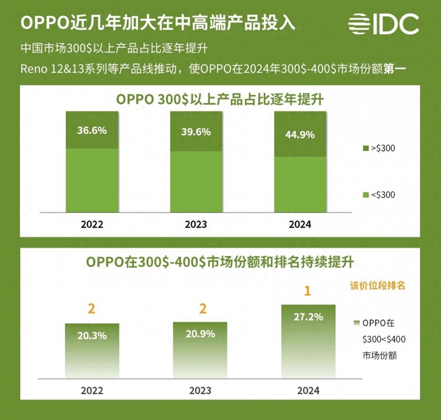 1 月 20 日,根據(jù) IDC 的數(shù)據(jù)顯示,OPPO 在中國市場 300 美元以上的產(chǎn)品占比逐年提升,并且在 Reno 12 和 Reno 13 等產(chǎn)品線推動下,300-400 美元的市場份額中以 27.2% 的成績位列第一。
